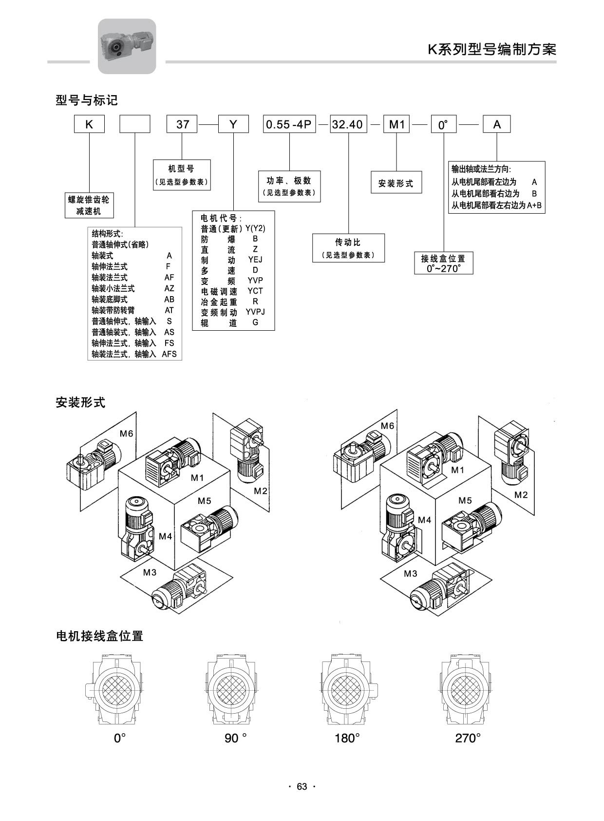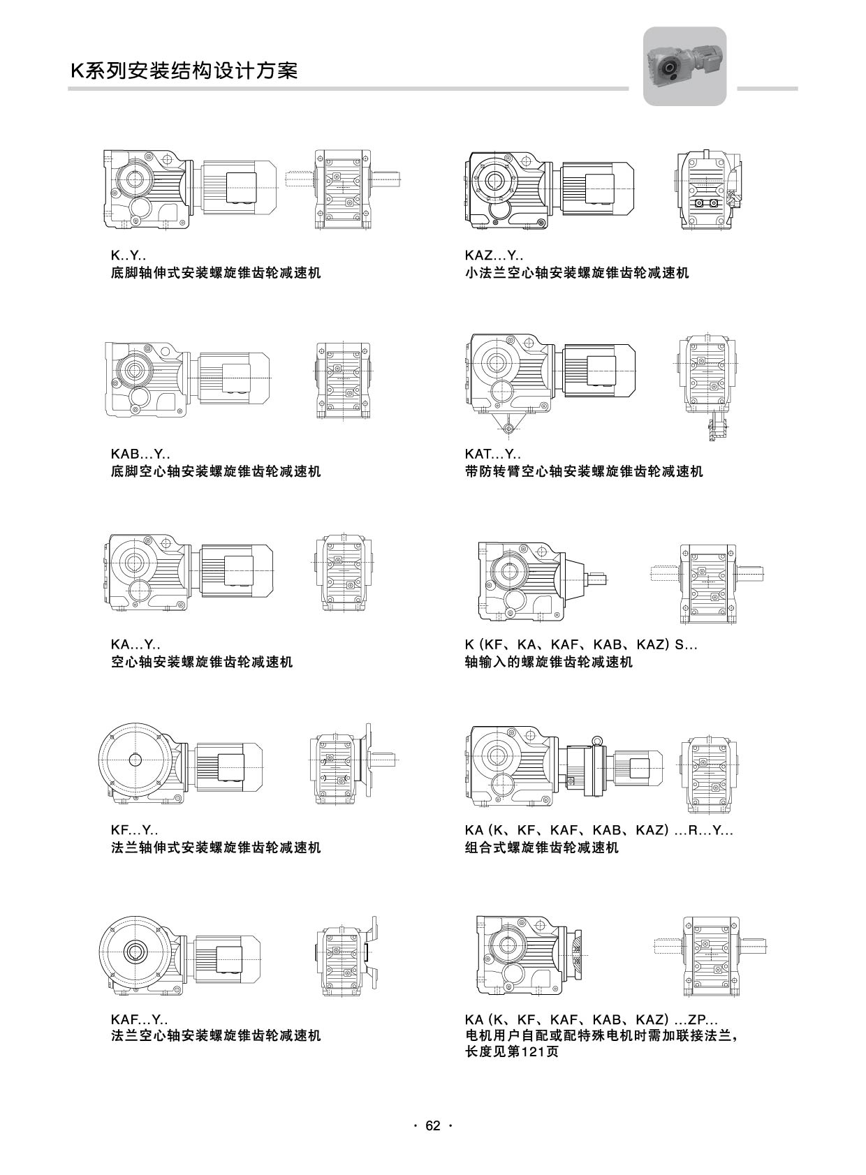 结构形式:K-轴伸式、底脚安装;KA-轴装式联接;KF-轴伸式、法兰安装;KAF-轴装式、法兰安装;S-表示轴输入。
